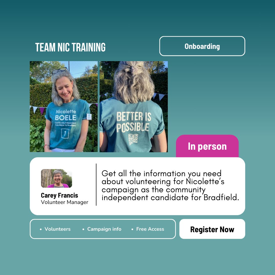 Come to our onboarding session and get all the information you need about volunteering for Nicolette's campaign as the community independent candidate for Bradfield.